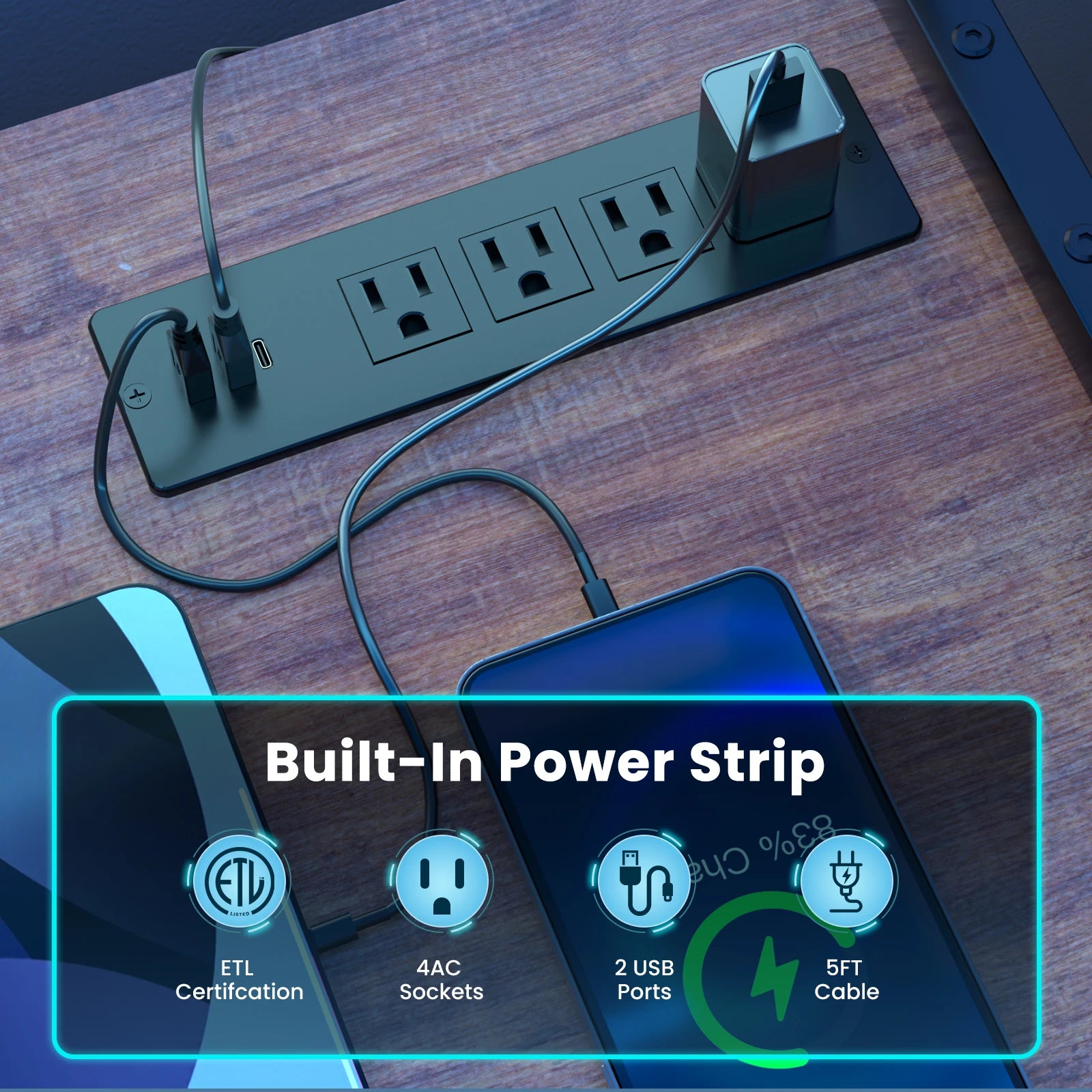 Maximize your space and performance with this 67″ L-Shaped Gaming Desk — designed for multitasking and immersive gaming, it features a built-in power outlet, spacious work surface, and a stylish brown wood finish.