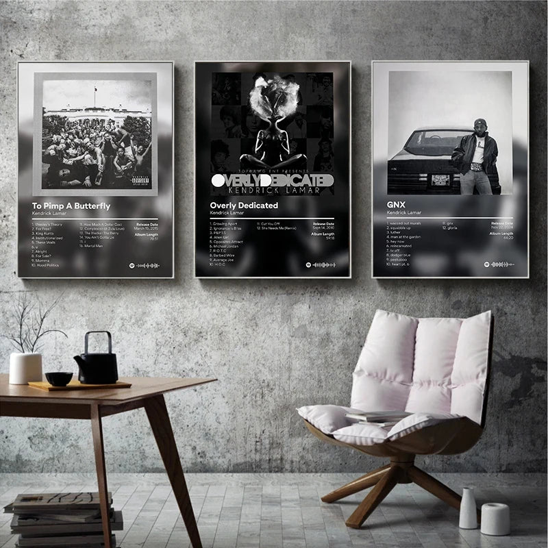 Celebrate hip-hop royalty with these bold canvas posters featuring iconic album covers of Drake, Kanye West, and Kendrick Lamar — perfect wall art for fans of rap culture and modern music décor.