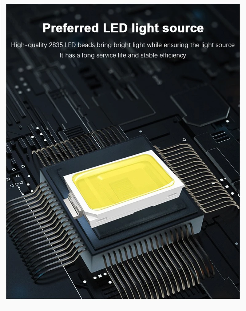 Durable ABS or aluminum alloy body with built-in LED module and rechargeable battery.