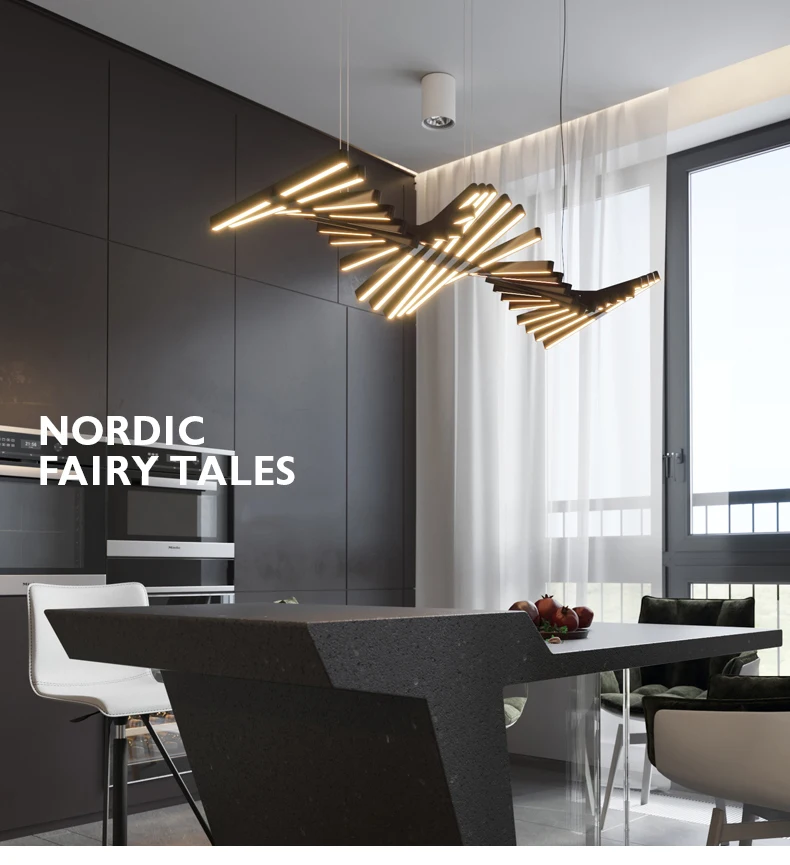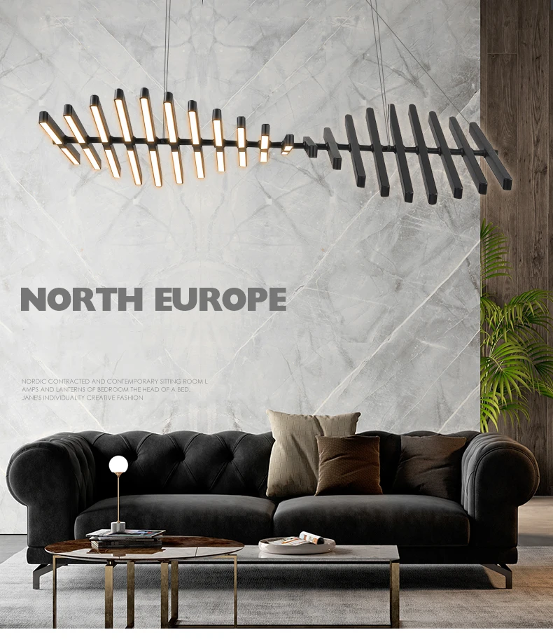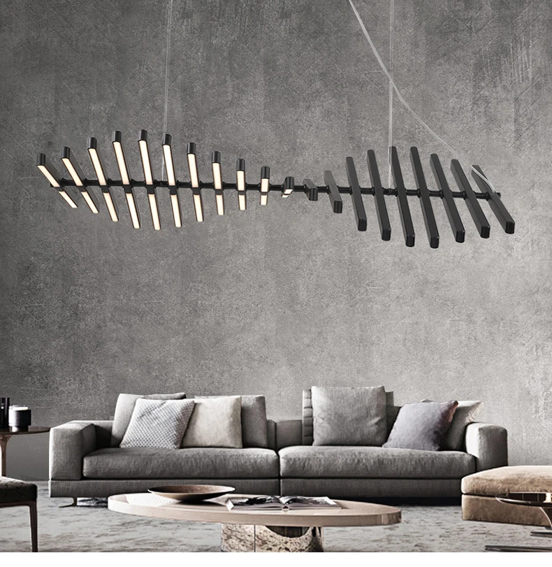 Sculptural and sleek, this Nordic fishbone chandelier delivers modern elegance through minimalist lines — a perfect lighting piece for living rooms, creative offices, and high-end dining interiors.