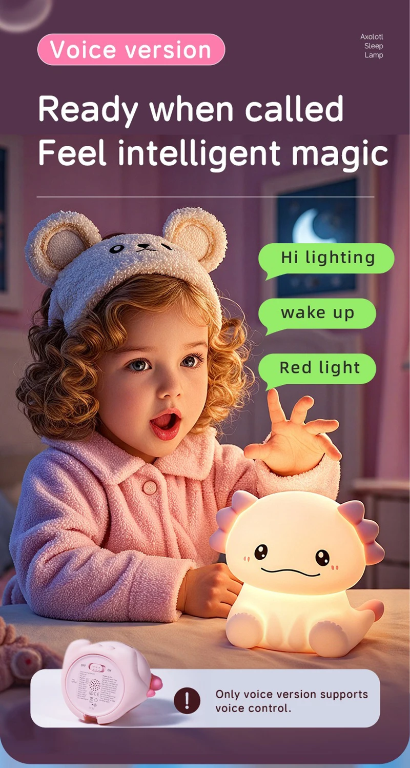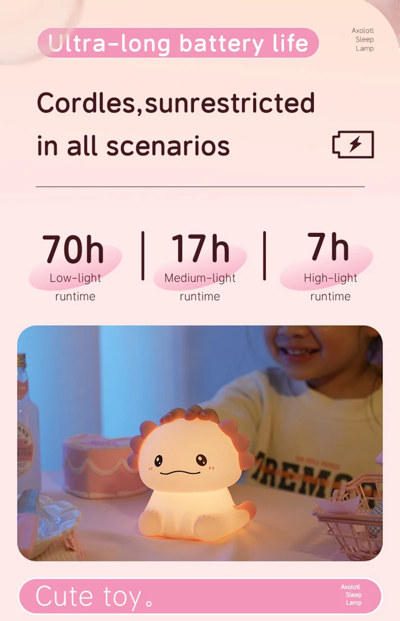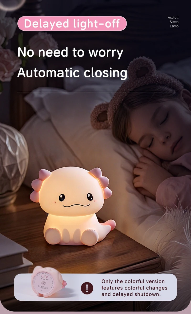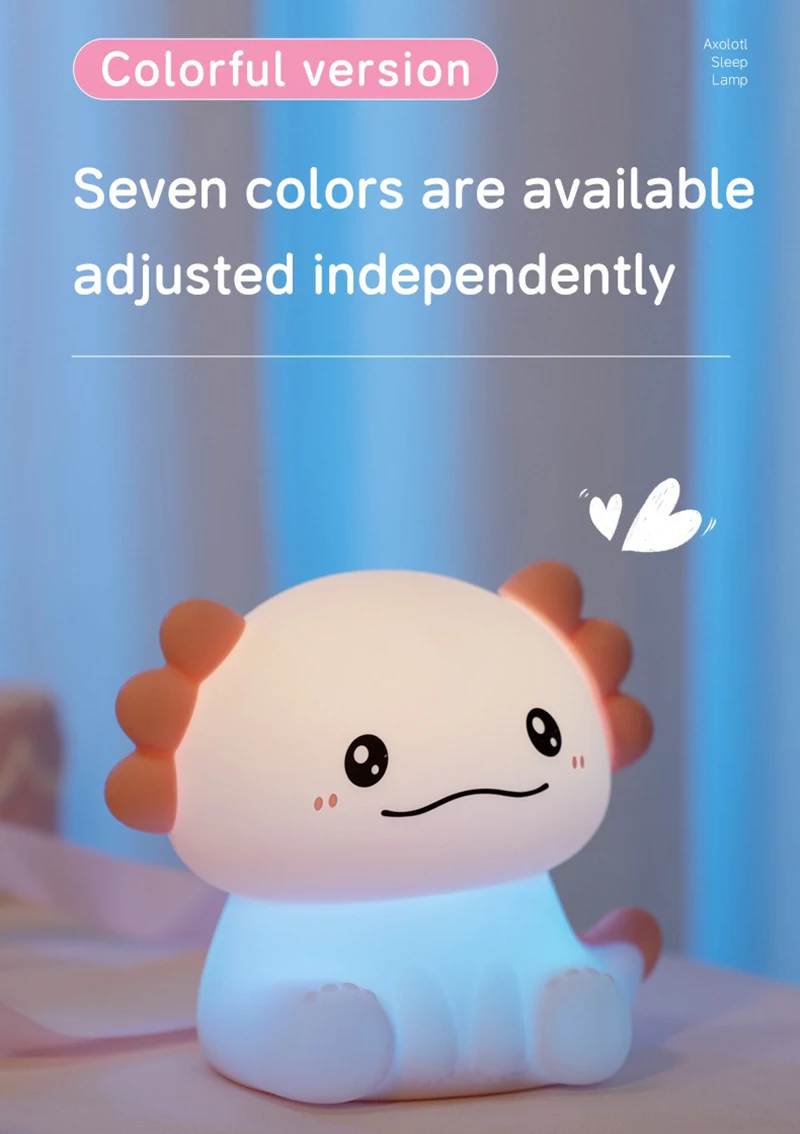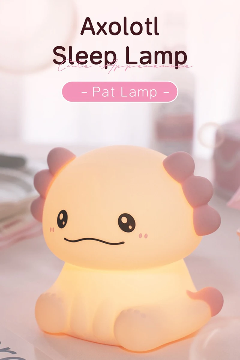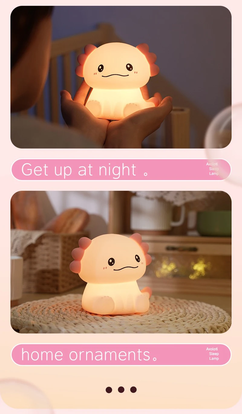 Cute pink axolotl design adds charm to any nightstand or nursery