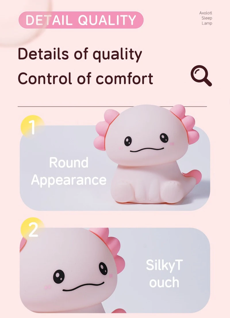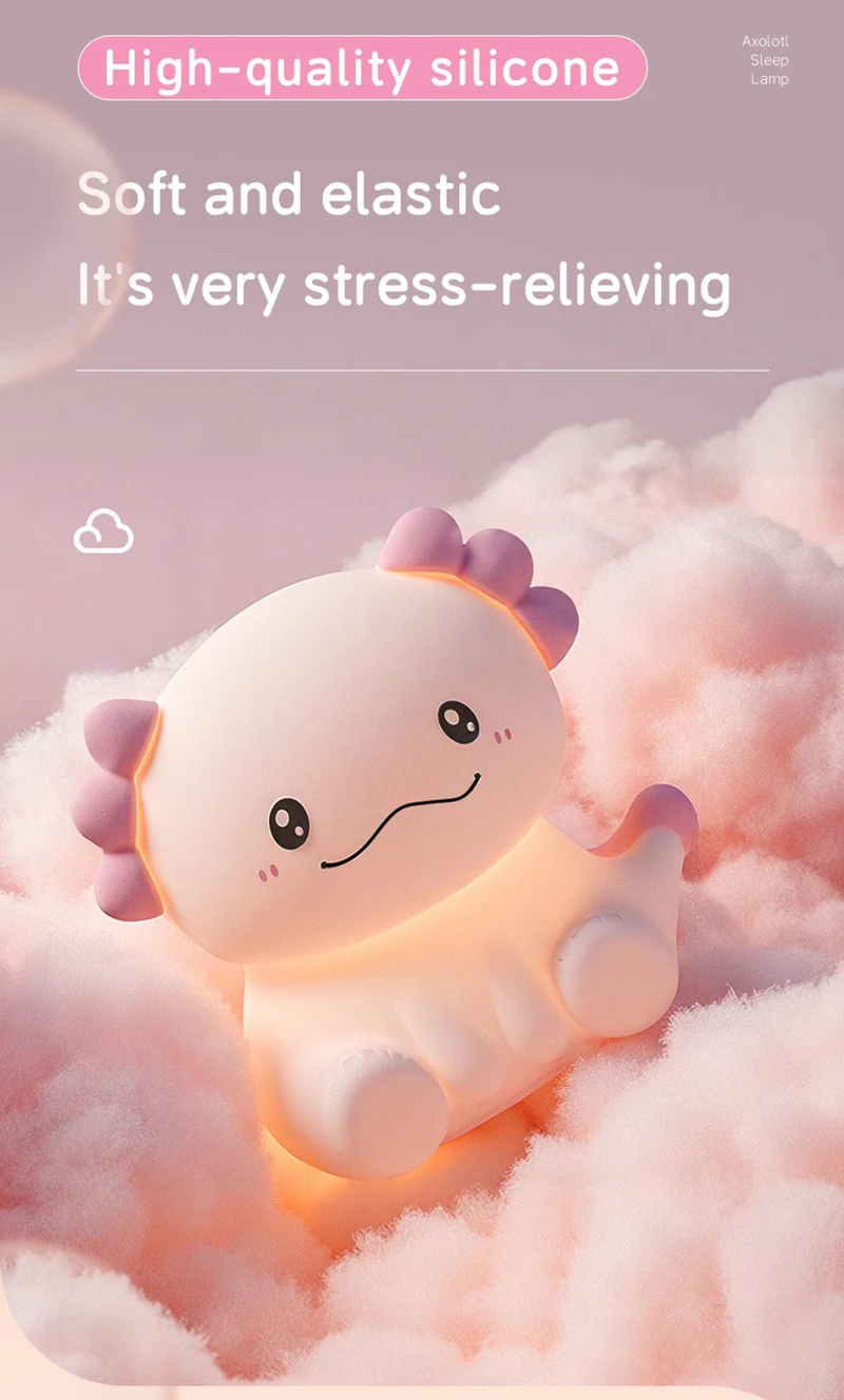 Pink Axolotl LED Night Light – USB Rechargeable Touch Lamp with 3 Brightness Levels & Timer